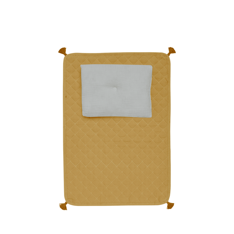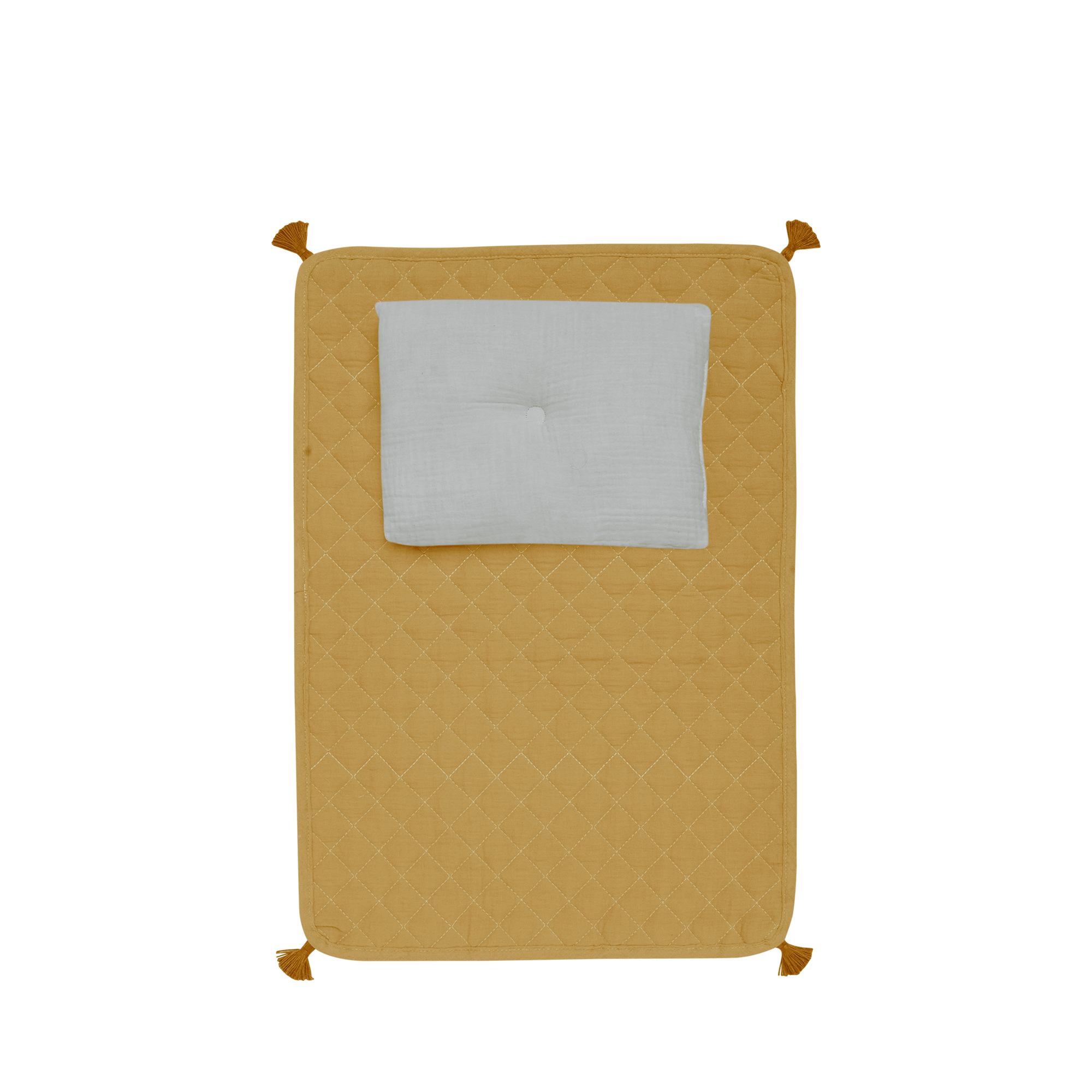 Tuck your Dinkum in for a sunshine snooze. This golden bedding set turns every Strolley into a travelling nap spot, picnic place, or dreaming nook. With a tiny tasselled duvet and a soft pillow, it’s made for slow days and sweet rests.