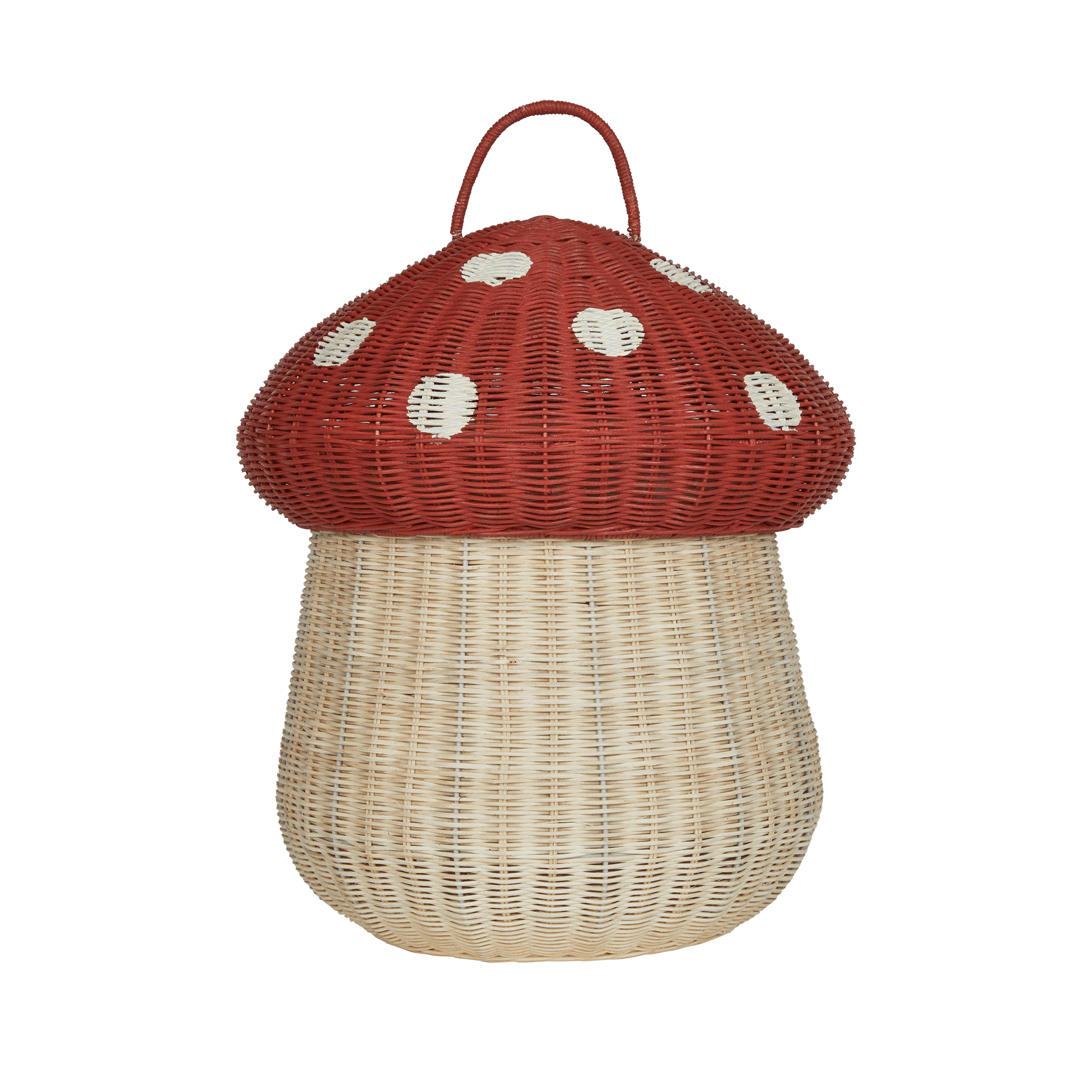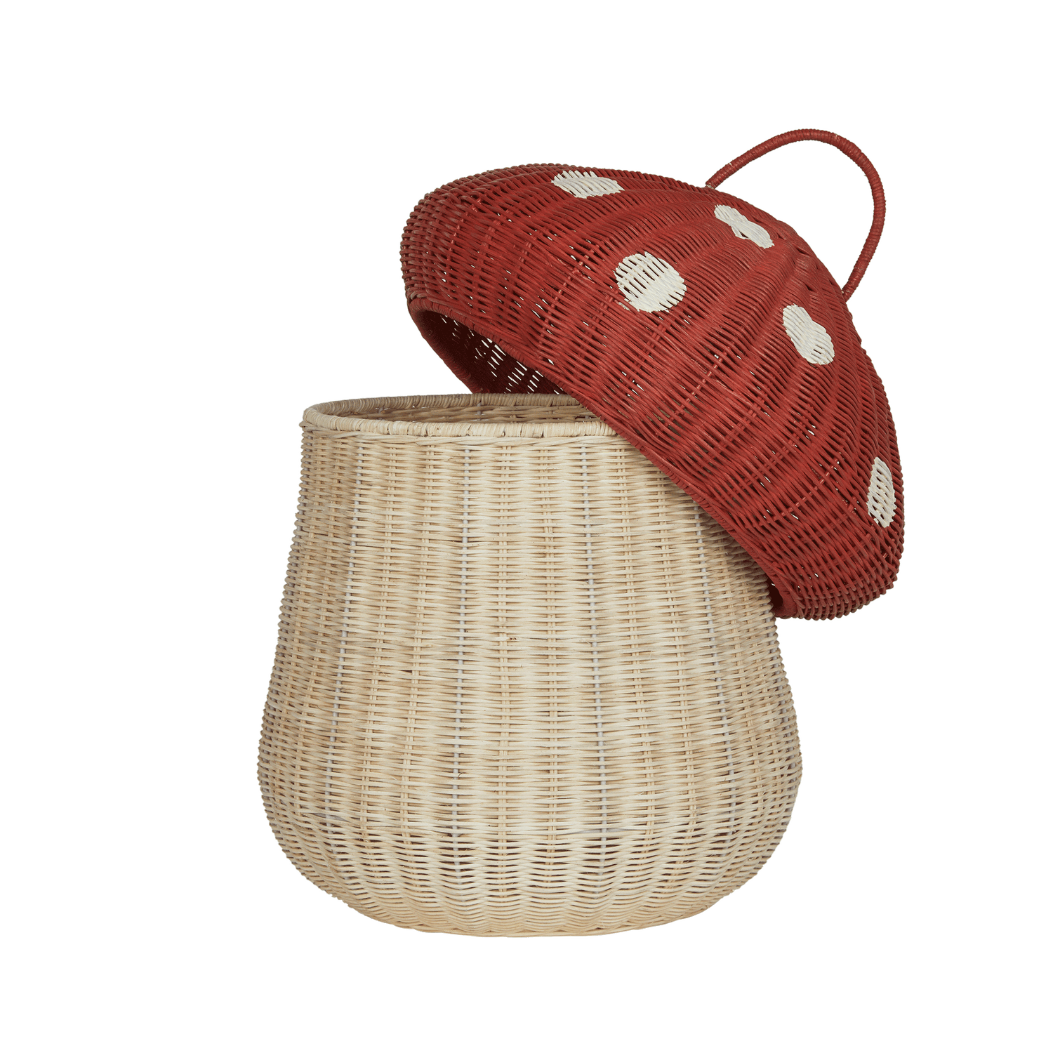 Shaped like a toadstool plucked straight from a fairy tale, the Mushroom Storage Basket is a storage solution disguised as decor. Handwoven from 100% natural rattan, it features a roomy base and a bold red domed lid, with white spots and finished with a handy little loop for easy lifting.