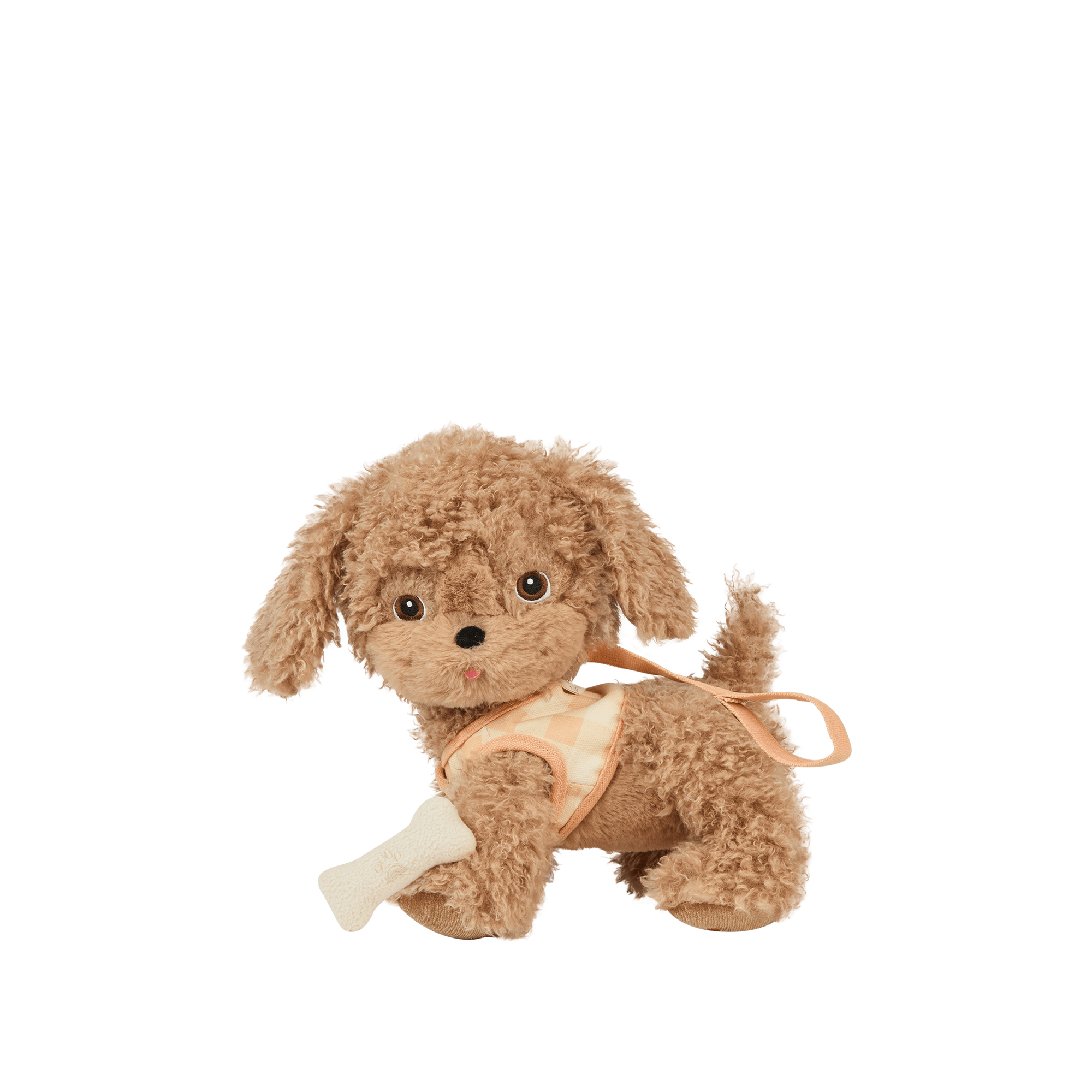 • Goldie comes with a removable canvas harness, lead, and bone treat.