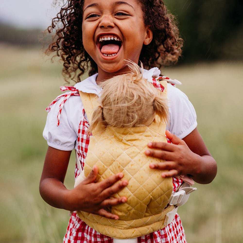 For the little one who takes their Dinkum everywhere. Whether it’s a trip to the garden, a grocery run with Mum, or a very important adventure to the lounge room, this golden carrier keeps Dinkum dolls tucked in close. With squishy straps and a padded pouch, it’s comfy, secure, and full of possibility. Just clip in and go – hearts don’t carry themselves, after all.